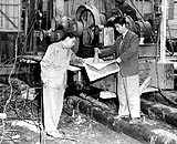 しょうがないから、大成建設が入札して取って日本でつくって行ったんですよ。そして向こうで組み立ててテンションかけようと思ったら、向こうの請負が日本の製品じゃ危いとか何とかいって、なかなか引き受けない。しゃくにさわったから、トビの若いのを15〜6人達れて行ったら、向こうのユニオンが同人数の職人にお金を払えというんですよ。そいつらは日なたぼっこしている。それで日本から行ったトビが地下たびはいて阿修羅のごとく働くし、タッタッとのぼってピタッときめる。最後にテンションかけて足場をはずすときなんか涙が出るほどで、向こうのトビたちもはじめは日なたぼっこしていたけど、日本人があんまり要領よくやるんで驚いてましたね。