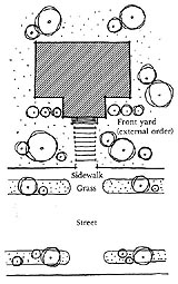 By contrast, if you walk along a residential street in the United States or Australia, you find quite a different sight. From the street, the pleasant-looking houses are in plain sight and in front of the house is usually a lawn or front garden. One might wonder to whom this garden belongs. Upon entering one of these houses, you often find that it is difficult to see the front garden although people walking along the street can see it very well. Indeed, people pay special attention to their front gardens, knowing that an unkempt garden can invite censure. In some towns, indeed, prizes are awarded for beautifully kept gardens. This space, while it is without doubt part of the front of the house, is qualitatively speaking, and in the minds of citizens of the town, exterior space. The space itself is the same, but is thought of in very different ways.