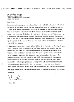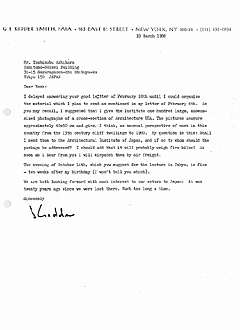 2月4日の私からの手紙で送るといった資料をまとめるのにすっかり遅くなってしまいました。前にも書いたように“アーキテクチャーUSA”の大きい美術館サイズの断面図の写真100枚を日本建築学会に差し上げようと思っています。写真のサイズは約40×50で、この国の13世紀の崖の上の住宅から1980年までの作品に対するこれまで誰も述べていない見解を示していると私は思っています。そこで私の質問ですが、学会に宛てて送るとしたら、だれ宛に送ればよいのか名前を知らせて下さい。たぶん5kgの重さになると思いますが、返事があり次第航空便で送ります。