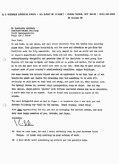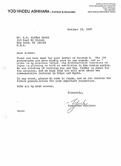10月5日付けのお手紙ありがとう。あなたが送って下さった100枚の写真は素晴らしいものです。この前の手紙でも書いたように、日本建築学会はあなたの展覧会を来春に企画しています。あなた方ご夫妻をご招待するつもりです。その際東京と京都で記念講演をしていただきたいと思っています。