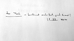 あなたの刺激的な著書(EXTERIOR DESIGN IN ARCHITECTURE)は素晴らしい-序文に私の名前もみられて。家を離れていたのでまだ全部読む時間はなかったが、特にイタリアの都市の空間のすぐれた考察には興味をもちました。あなたの鋭い分析は、随分昔になるが、1950〜51年の2年間イタリアで過ごした時のことを懐かしく思い出させてくれました。