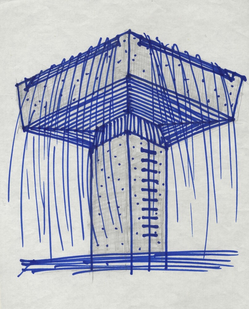 建築と環境にかかる環境造形の一種であり、空間を内包していないが、安全性、機能面からもあくまで建築の設計手法を用いてデザインした。百年記念と噴泉ということからは、渾渾と絶え間なく湧き上がる水が滔滔と流れ、滝状に落ちる様子をイメージしたと思う。これからの百年、あるいはそれ以上の年月へ対して静(造形)と滝のような落水の動を以って象徴とすることはどうだろうかとも考えてた。議事堂の建築からはシンメトリー、正面性、方形などが感じ取ることができ、配置については、両院玄関正面ということであったので、玄関の軸線上の設置を前提に、左右の軸線、鳥瞰的角度、眼の高さ等がチェックポイントになった。落水時と滝が止まっているときの両方の状態を想定し、正四角形あるいは円形ならば裏表のないものになるので、適した造形と考えた。水の落下際の形状、流量との関係、夜間照明などなど、分からないことだらけであったので、噴泉工事を担当した川村噴水の鎌倉の敷地内に実物大模型をセットし、芦原をはじめ関係者全員で実験を行い、一つ一つ問題をクリアしていった。いよいよ地上の造形が顔を見せ始めたその場に、芦原自身立ち会い、工事関係者を労うかたわら、竣工に向かって無事にこぎつくように、細心の注意で望むことを共に確認したことをよく思い出すことがある。